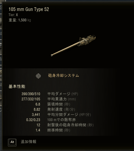 上の画像が主砲のスペックなのですが、精度が特に良いですね。砲身冷却システムにより0.23まで精度が良くなります。使ってみたところ450mぐらい離れていてもかなり当たる印象でした。照準時間も1.4秒なのでストレスなく射撃できると思います。