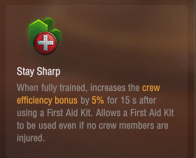 救急キットを使用すると、15秒間搭乗員の能力を5%上昇させる。(負傷者がいなくても救急キットを使用可能)というものです。