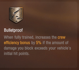 ブロックしたダメージ量が自車両の初期HPを超えた場合、搭乗員の能力が5%増加する。というものです。