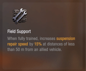 味方車両が50m以内にいると、履帯の修理速度が15%増加する。というものです。