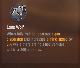 半径300m以内に味方車両がいない場合、散布界と照準速度が5%増加。というものです。