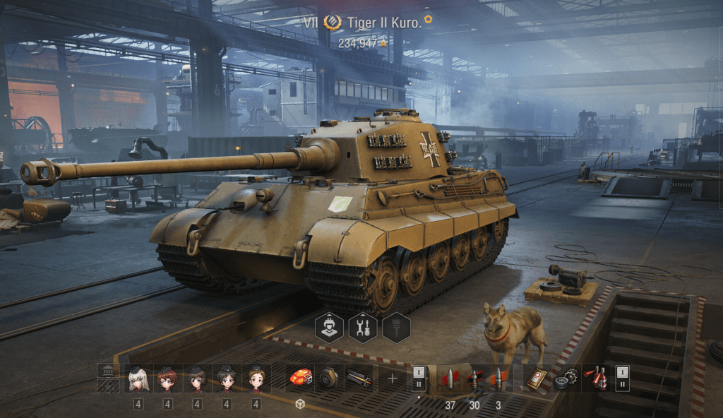 黒森峰のティーガー2ですね。ドイツの重戦車で装甲は砲塔が185mm、車体が傾斜の効いた150mmとバフ前の本家Tiger2なのでかなり頼りになります。同格の弾であればかなり弾けると思います。