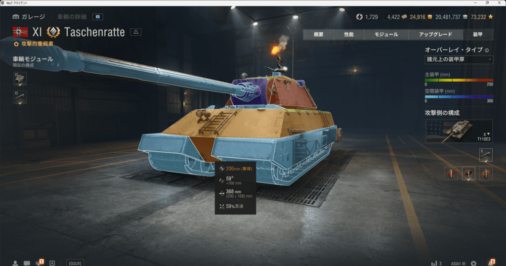 後はコーラを積んだアメリカ重戦車ですね。最近Tier11のT803を使っているのですがコーラを乗せると乗員スキルと合わせて精度が0.31になるのでかなりTaschenratteを倒しやすいと感じました。まあ、HPが多いのでかなりの弾を当てないといけないのですが・・・