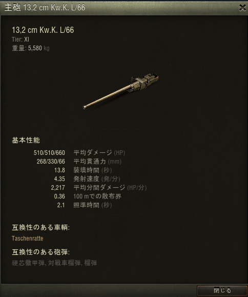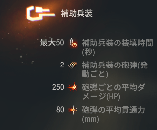 最終スペックはこんな感じです。50秒毎に2発、平均250ダメージを与えます。貫通は80mmあるので装甲の薄い車両に有効だと思います。とはいえ、重戦車会場にそんな薄い装甲の車両はまずいないです。まあ、後方に待機している駆逐戦車が見えればその限りではないですが。