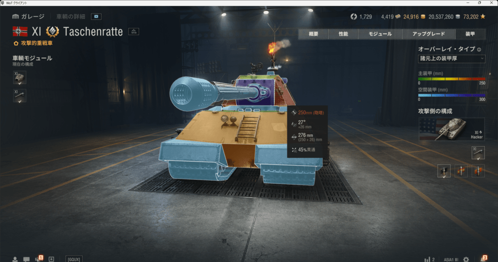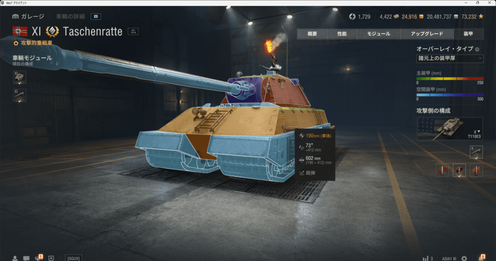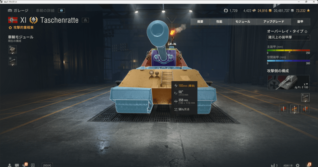 車体上部は楔形装甲に近い形状をしています。重戦車の弾であればプレミア弾でも安定して弾いてくれると思います。ただ、画像にもあるように駆逐の高貫通プレミア弾には装甲が意味をなさないので過信は禁物です。逆を言えばE100駆逐やアメリカのE3,E4駆逐の重要性が増したともいえます。